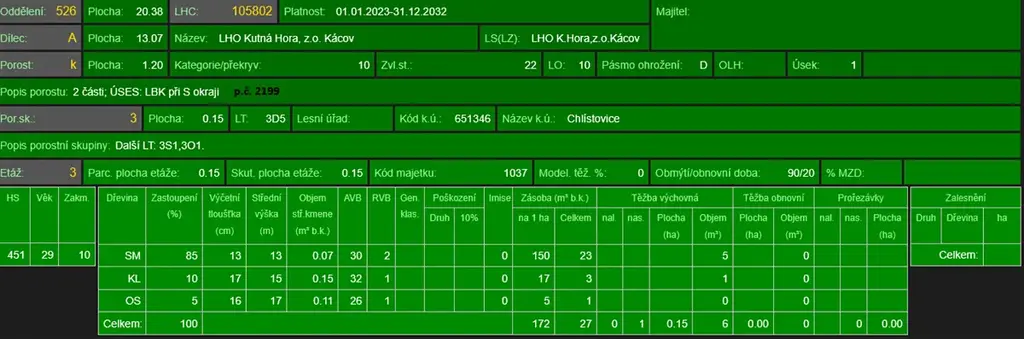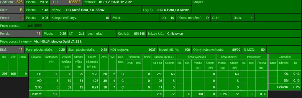 - p.č. 2350 vedená jako lesní pozemek o celkové výměře 2 462 m2, z toho vlastníme podíl 1/4 tedy 616 m2 (stáří lesa 108 let - zastoupení dřevin olše. modřín, střemcha obecná).