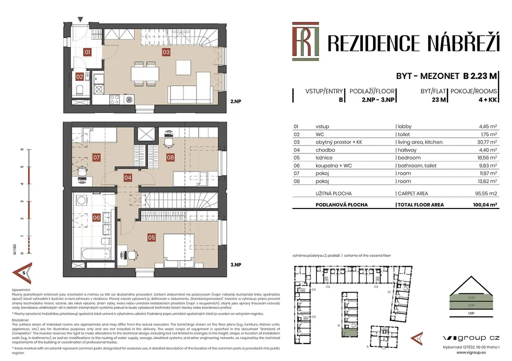 Exkluzivní mezonetový byt 4+kk v Brandýse nad Labem-Staré Boleslavi. Tento byt se nachází v netypické lokalitě ostrova v klidné části obce a je součástí projektu Rezidence Nábřeží. Byt se nachází na 2. a 3. podlaží domu a má celkovou podlahovou plochu 100 m². Hlavní orientace bytu je v severojižním směru. Na spodním, vstupním podlaží nelezneme obývací pokoj s kuchyňským koutem, na vrchním podlaží ve 3.NP domu jsou pak po interiérovém schodišti přístupné celkem další 3 ložnice a také více jak 10m² koupelna s WC. Ta je přisvětlena přírodním světlem ze střešního okna. Kromě malé ložnice - pracovny, která má střešní okna na severní stranu tak obě další větší ložnice mají pak vikýřová okna na jižní stranu. Ložnice označená č.5 navíc ještě klasické okno na západní stranu směrem k řece Labi a také s krásným výhledem na Zámek Brandýs nad Labem.