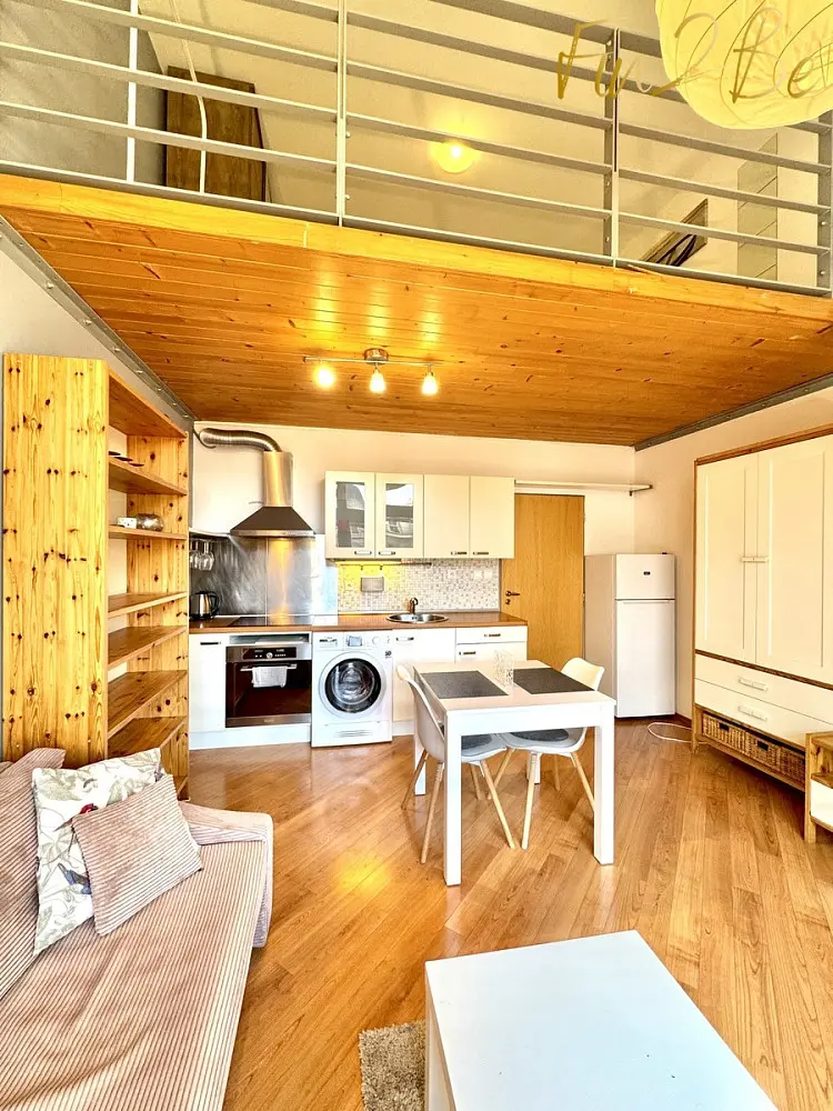 Podlahová plocha bytu činí 24 m², přičemž velkým benefitem je otevřené pochozí patro se zábradlím, které slouží jako spací část. Díky tomu se nabízí celková užitná plocha až 38 m² a působí vzdušněji a prostorně.