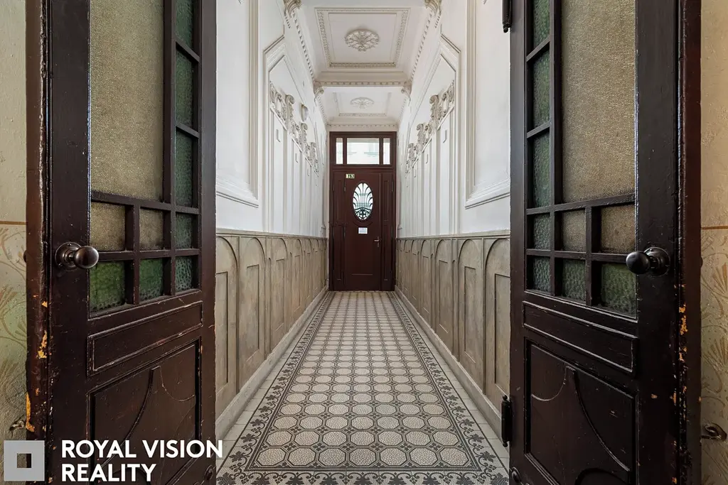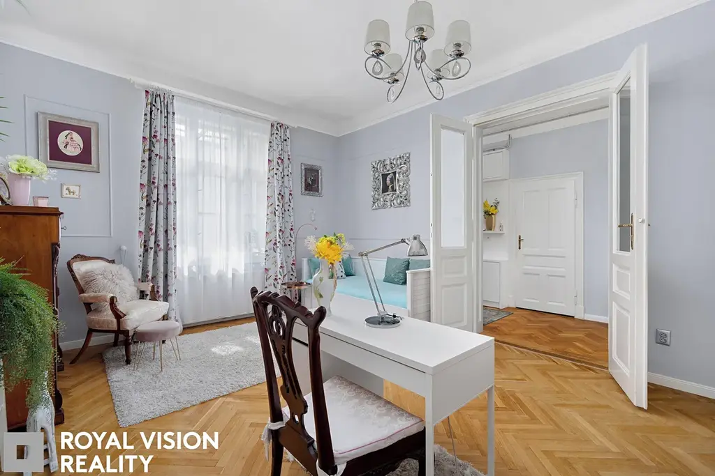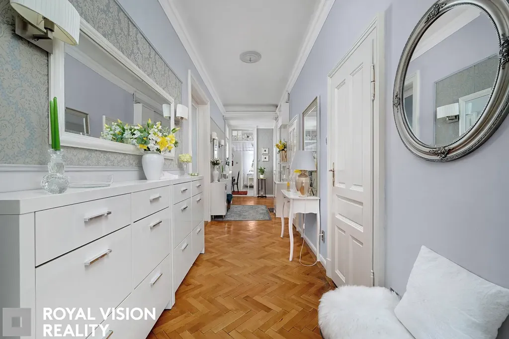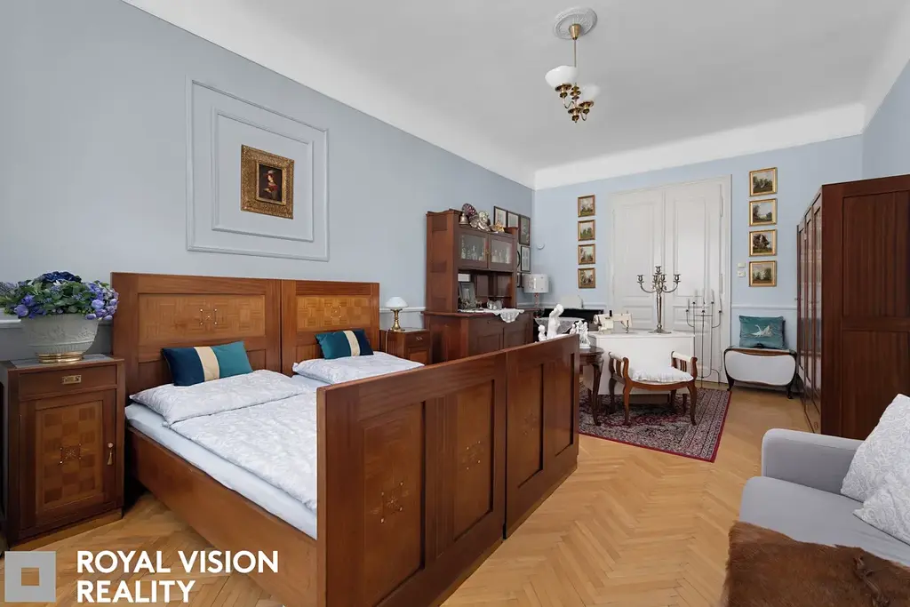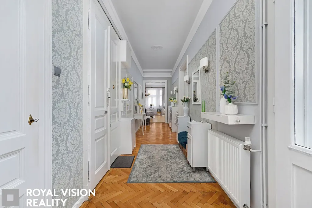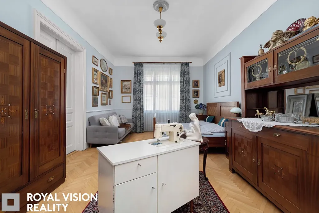 Celý byt působí velmi vkusně a udržovaně, zachovává si historické prvky jako dřevěné zárubně a dveře, které dodávají interiéru jedinečný charakter. Díky své velikosti a dispozici je ideální pro větší rodinu.