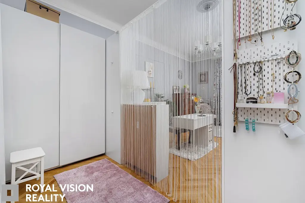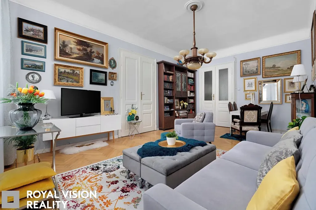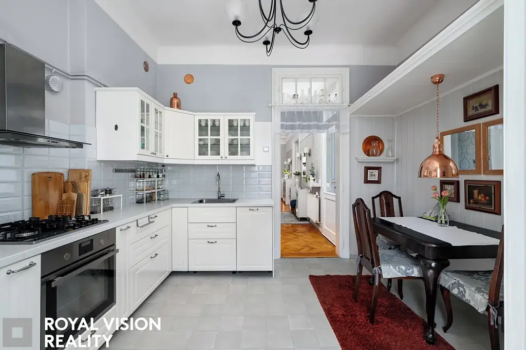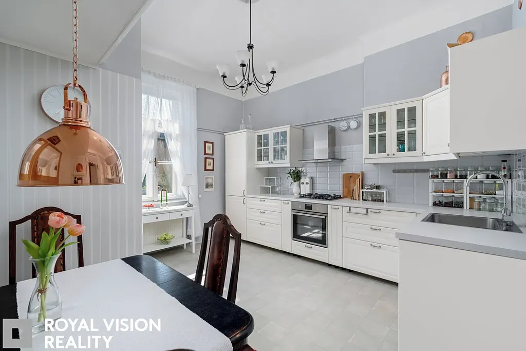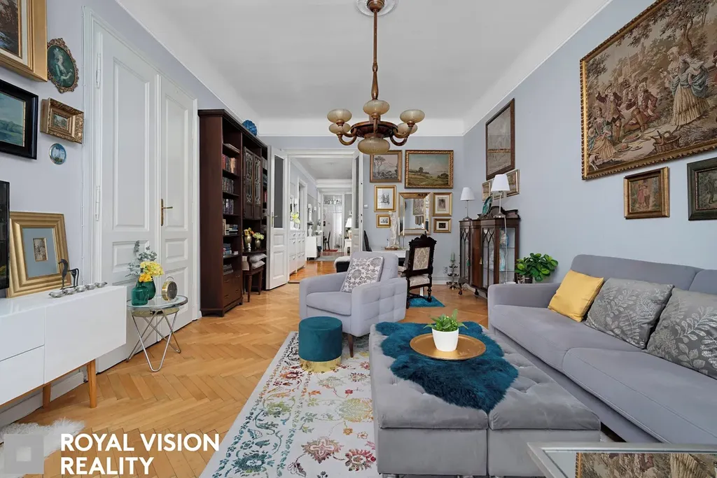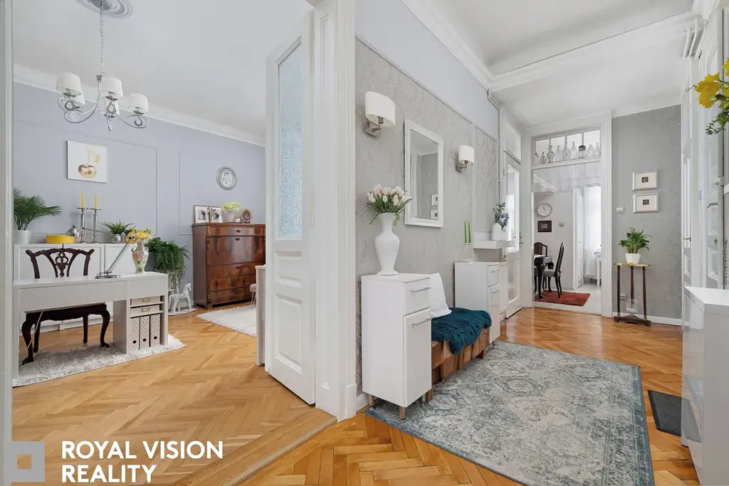 Celý byt působí velmi vkusně a udržovaně, zachovává si historické prvky jako dřevěné zárubně a dveře, které dodávají interiéru jedinečný charakter. Díky své velikosti a dispozici je ideální pro větší rodinu.