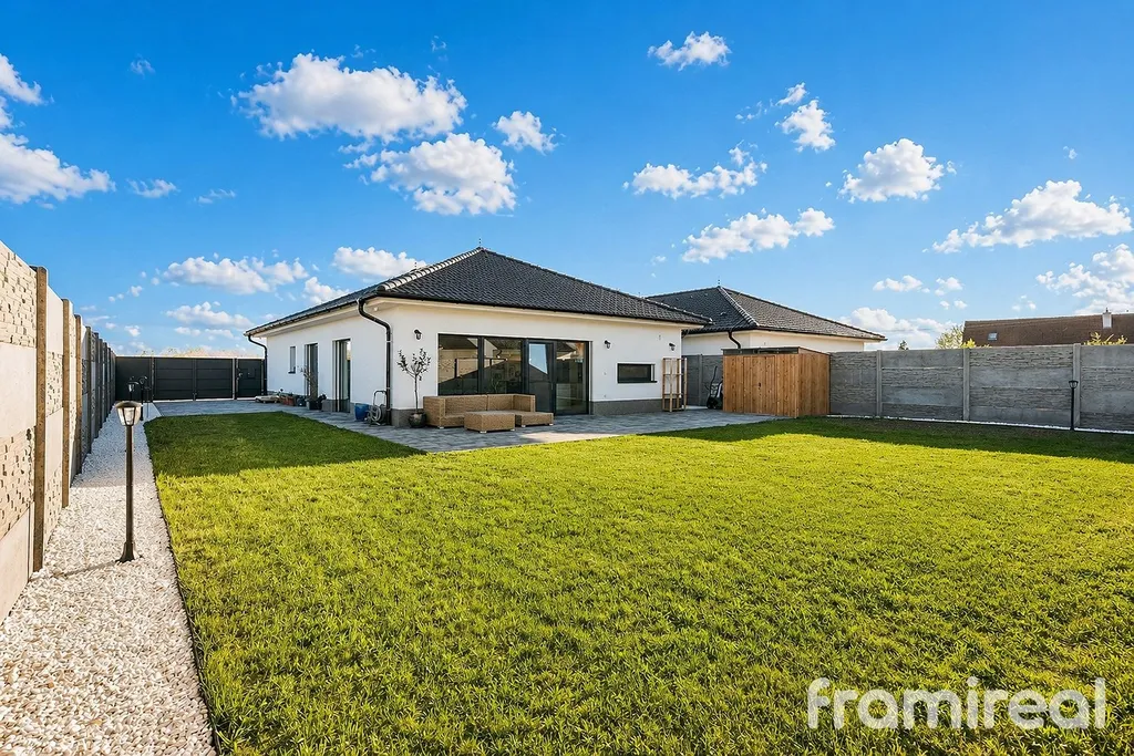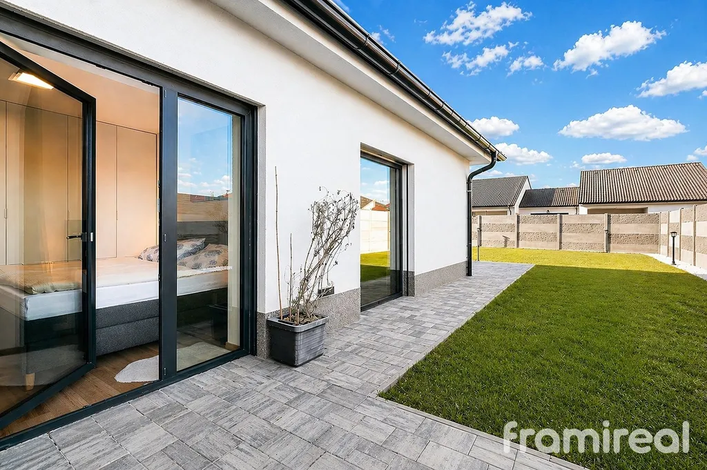 Na pozemku je hotová terasa s venkovním osvětlením, ideální pro večerní posezení. Zahrada je připravena k dokončení podle vlastních představ. Parkování je již vyřešeno – na pozemku je dostatek místa pro více vozů.