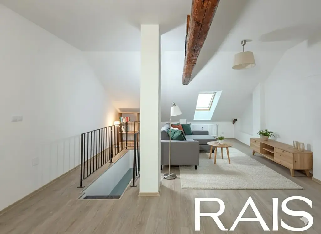 Byt je situován ve 3. a 4. nadzemním podlaží historického domu a jeho celková plocha činí 63,3 m². Dispozičně je řešen jako dvoupodlažní – spodní úroveň o velikosti 21 m² tvoří otevřený obytný prostor s obývacím pokojem a koupelnou. Horní podlaží o výměře 42,3 m² nabízí dostatek prostoru pro ložnici, kterou lze doplnit o pracovní kout, knihovnu či relaxační zónu.