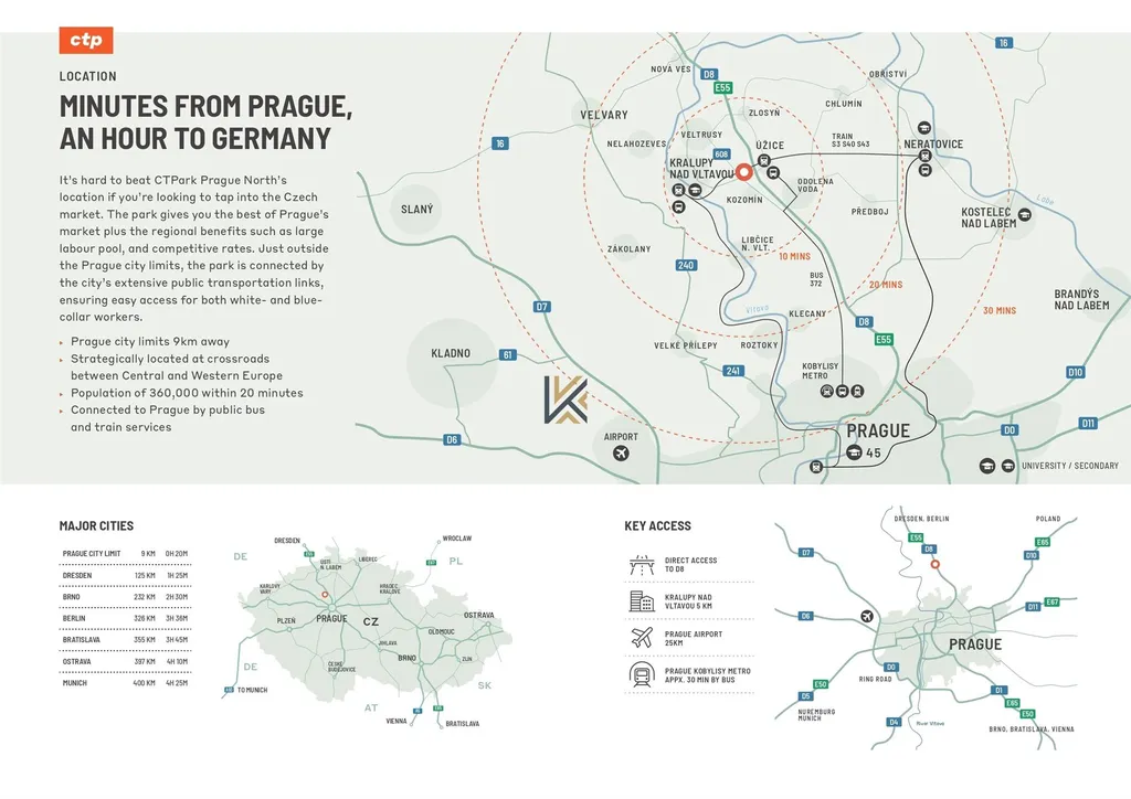 CTPark Prague North, špičkové obchodní centrum určené pro moderní podniky. Toto multifunkční obchodní centrum spojuje logistiku, skladování, výrobu, maloobchod, showroomy, kanceláře a další, vše na jednom místě. CTPark Prague North se nachází v bezprostřední blízkosti Prahy, má vynikající napojení na veřejnou dopravu a přímý přístup na dálnici D8, čímž spojuje městskou dostupnost s výhodami regionální polohy. Díky své centrální poloze v Evropě se v dosahu pěti hodin jízdy autem nachází téměř 60 milionů lidí, včetně klíčových trhů, jako jsou Německo a Rakousko.