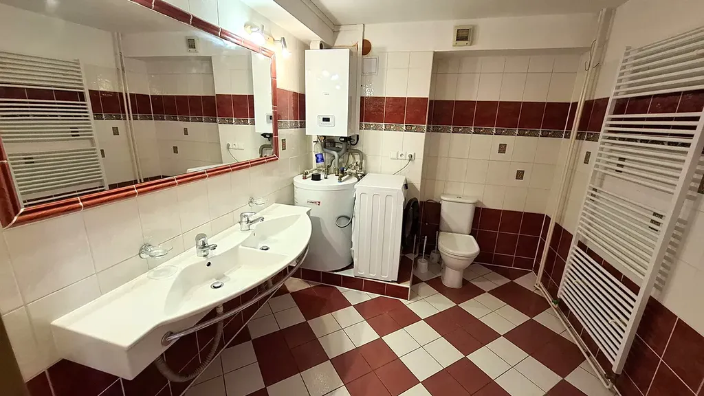 K vytápění a ohřevu vody slouží elektrický kotel umístěný v koupelně v prvním patře.