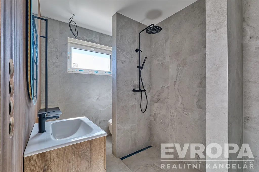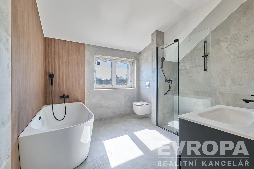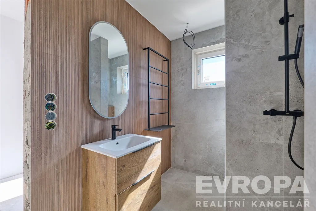 Každé podlaží disponuje vlastní koupelnou s toaletou – praktické řešení, které ocení každá rodina. Hlavní ložnice nabízí vlastní samostatnou šatnu – příjemný nadstandard, který si rychle oblíbíte. V jednom z domů je také připravena instalace krbových kamen, která v chladných večerech vytvoří tu správnou domácí atmosféru. Po celém domě jsou položeny moderní vinylové podlahy, v koupelnách a technické místnosti pak keramická dlažba.