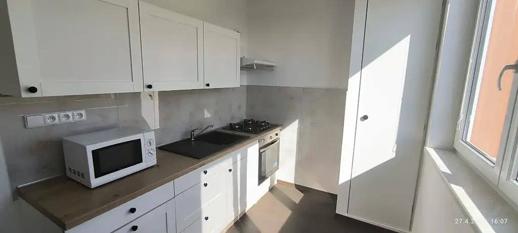 V kuchyni je nová kuchyňská linka bílé barvy se sporákem, vestavěnou troubou a digestoří. Praktická spíž na potraviny.