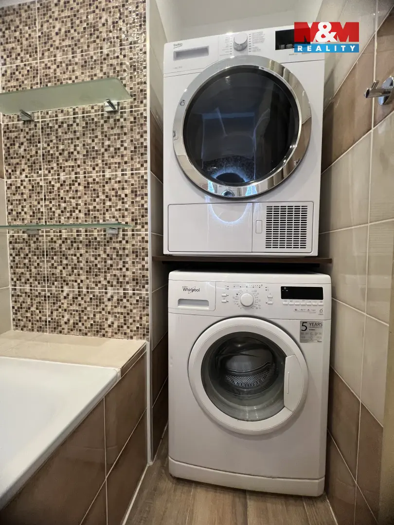 Kuchyně je plně vybavena sklokeramickou varnou deskou, elektrickou, mikrovlnou troubou a lednicí. Koupelna je vybavena pračkou a sušičkou, takže veškeré zázemí pro pohodlné bydlení máte k dispozici bez nutnosti dalších investic.