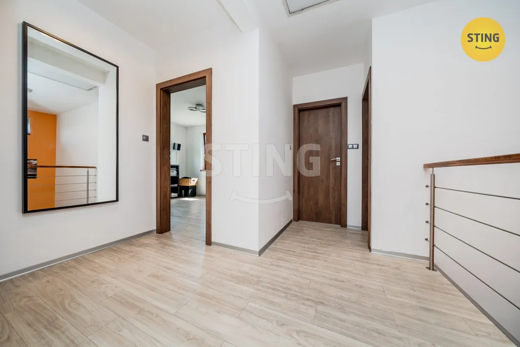 Dominantou domu je obývací pokoj s jídelnou, kuchyní a schodištěm do druhého patra. Z tohoto obytného prostoru máte možnost vyjít přes balkónové posuvné dveře na dvě terasy. Jedna je na východ a druhá na sever, která je navíc zastřešena pergolou. Tyto terasy, může nový majitel využít dle své fantazie, ale nabízí se například relaxace v sauně a vířivce, nebo grilování a lenošení na zahradě. Druhé patro tvoří zejména tři samostatné obytné místnosti. V každém patře je pak koupelna a wc. Součástí prodeje je také vestavěný nábytek, který podtrhuje praktické a promyšlené řešení interiéru.