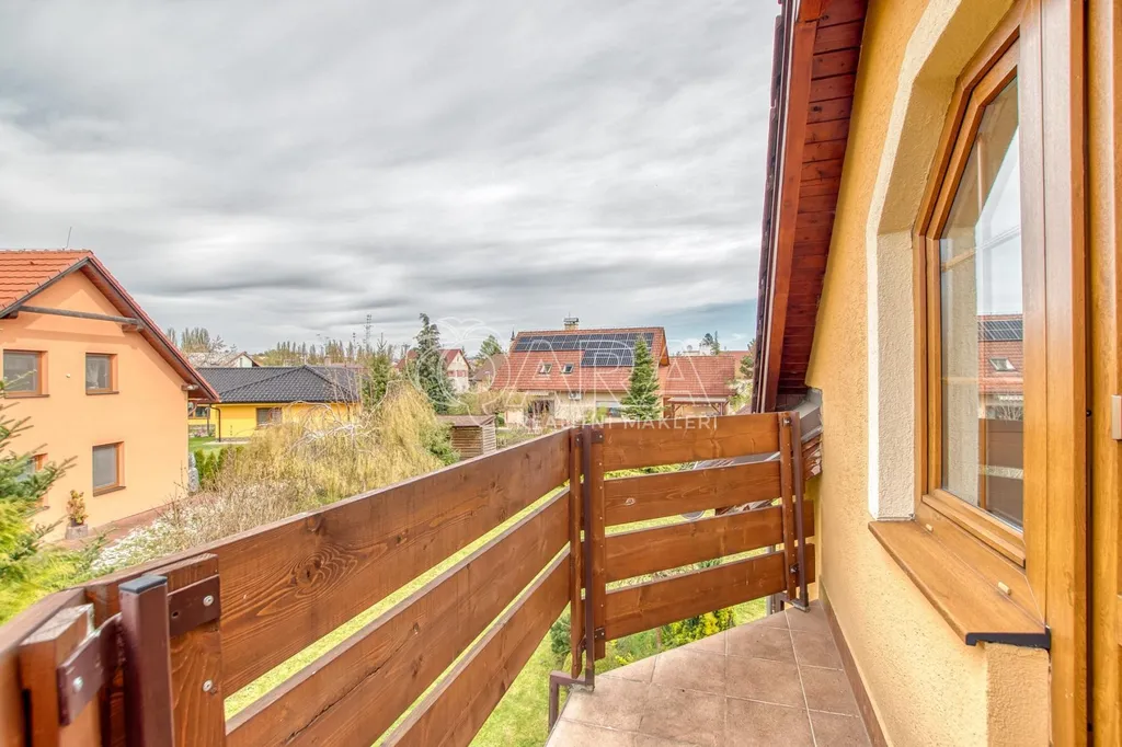 K domu patří dva balkony o velikosti 3 m² a 8 m² a terasa v přízemí. Součástí je technická místnost s kondenzačním kotlem a garáž o velikosti 25 m².