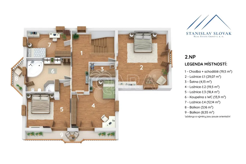 V patře najdete čtyři samostatné pokoje. Ložnice o velikosti 29 m² nabízí vlastní šatnu (4 m²) a přiznané stropy. Koupelna má přibližně 13 m² a je vybavena sprchovým koutem, rohovou vanou a toaletou. Součástí je také balkon orientovaný na západ.