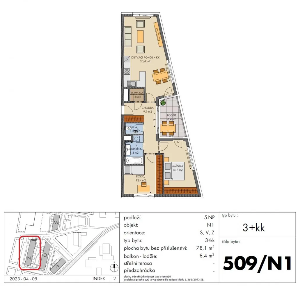 Bytová jednotka 3+kk o velikosti 78,1 m2 + lodžie 8,4 m2 se nachází v 5. nadzemním podlaží (z celkových šesti) s orientací na sever, východ a západ.
