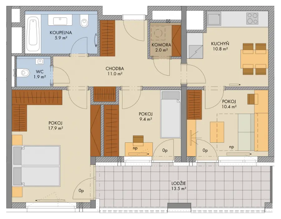 Bytová jednotka 3+1 o velikosti 73,6 m2 + lodžie 13,5 m2 se nachází ve 4. nadzemním podlaží (z celkových osmi) s orientací na jih.