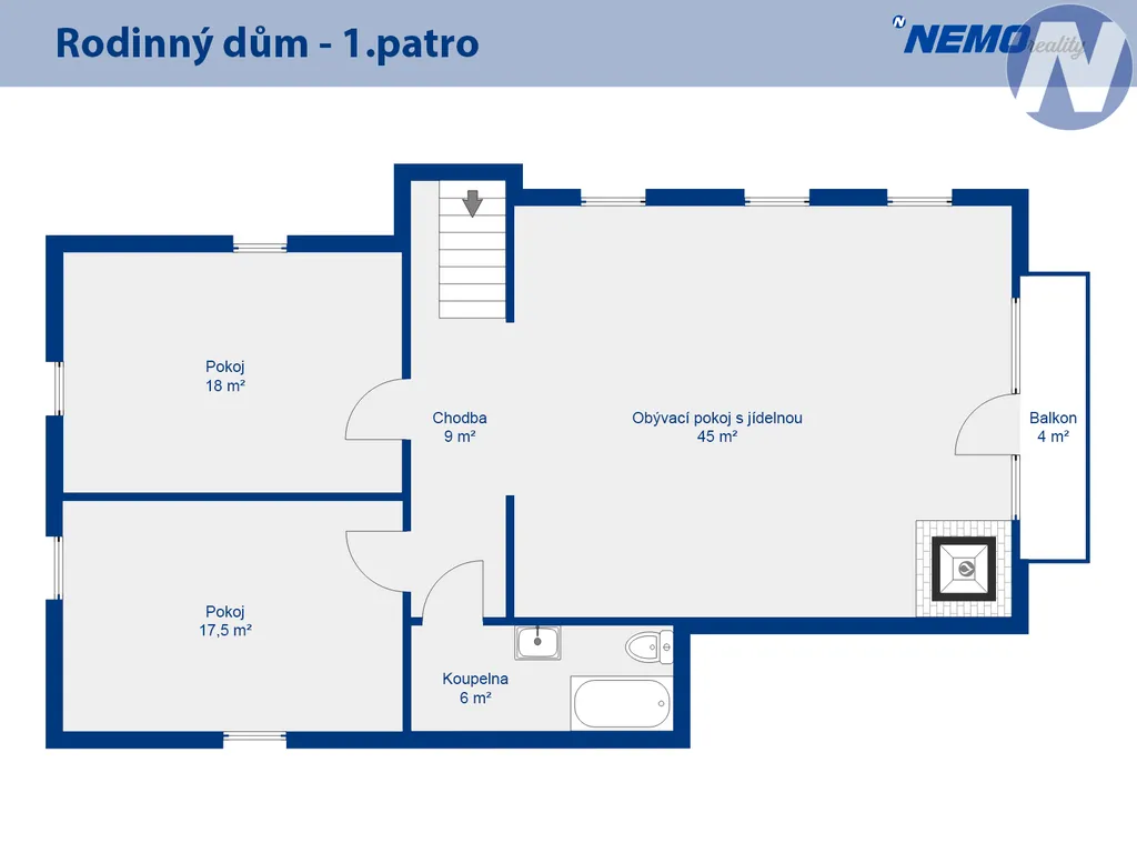 Srdcem celého domu je velkorysý obytný prostor v patře s obývacím pokojem a jídelnou o ploše 45 m², navíc s přímým vstupem na balkon. Právě tady dům ukazuje svoji nejsilnější stránku – vzdušnost, světlo, vysoký strop, krásnou atmosféru a prostor, kde se nežije jen prakticky, ale opravdu dobře. V patře se dále nachází dva pokoje, chodba a koupelna. V přízemí pak najdete velkou kuchyni, další pokoj, prostornou chodbu a další místnosti využitelné jako technické zázemí, prádelnu nebo sklad.