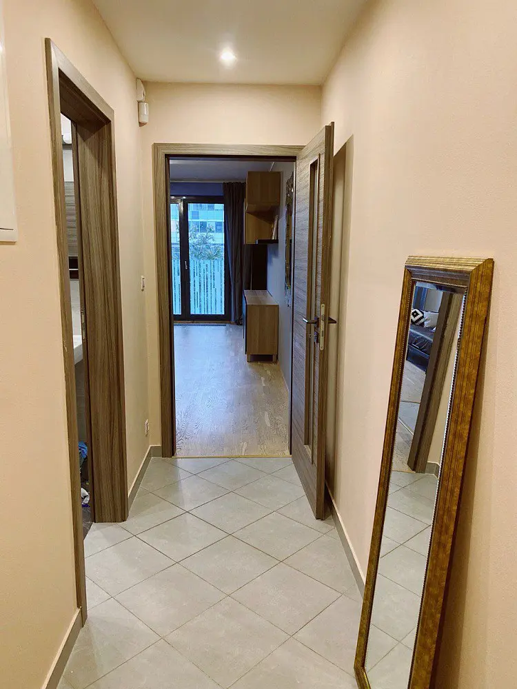 Apartmán má hezké francouzské okno a je zařízen nábytkem. Ve stejném patře, přímo naproti bytu je situován prostorný sklep.