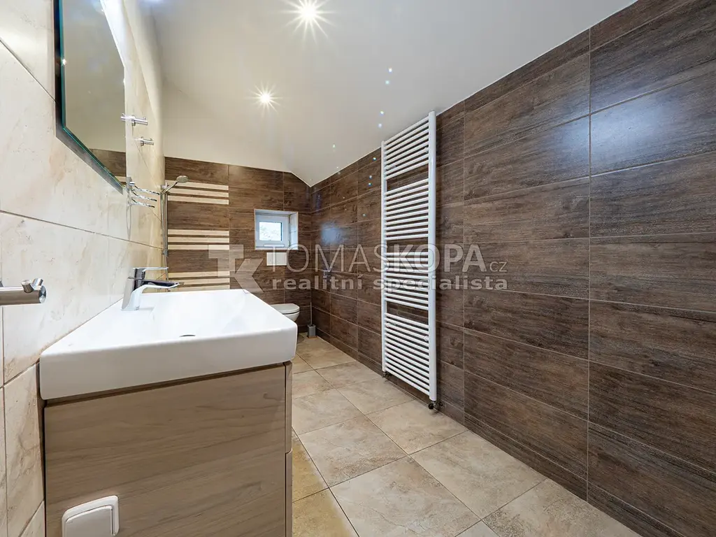 Všechny obytné místnosti jsou dokončené – moderní podlahy, bodové osvětlení, nové dveře i kompletní rozvody. Centrální chodba a schodiště jsou připraveny k finálnímu dokončení, což dává novému majiteli možnost vtisknout domu vlastní styl.