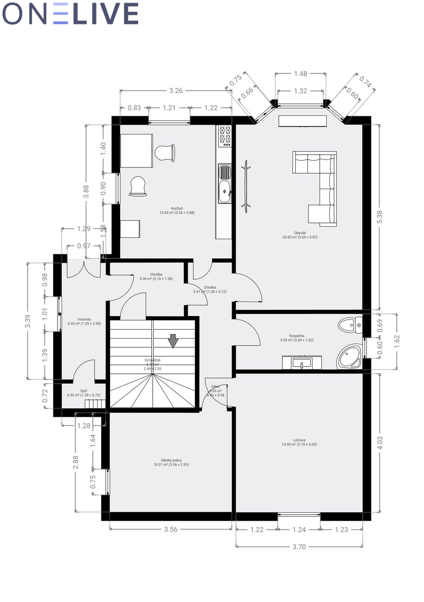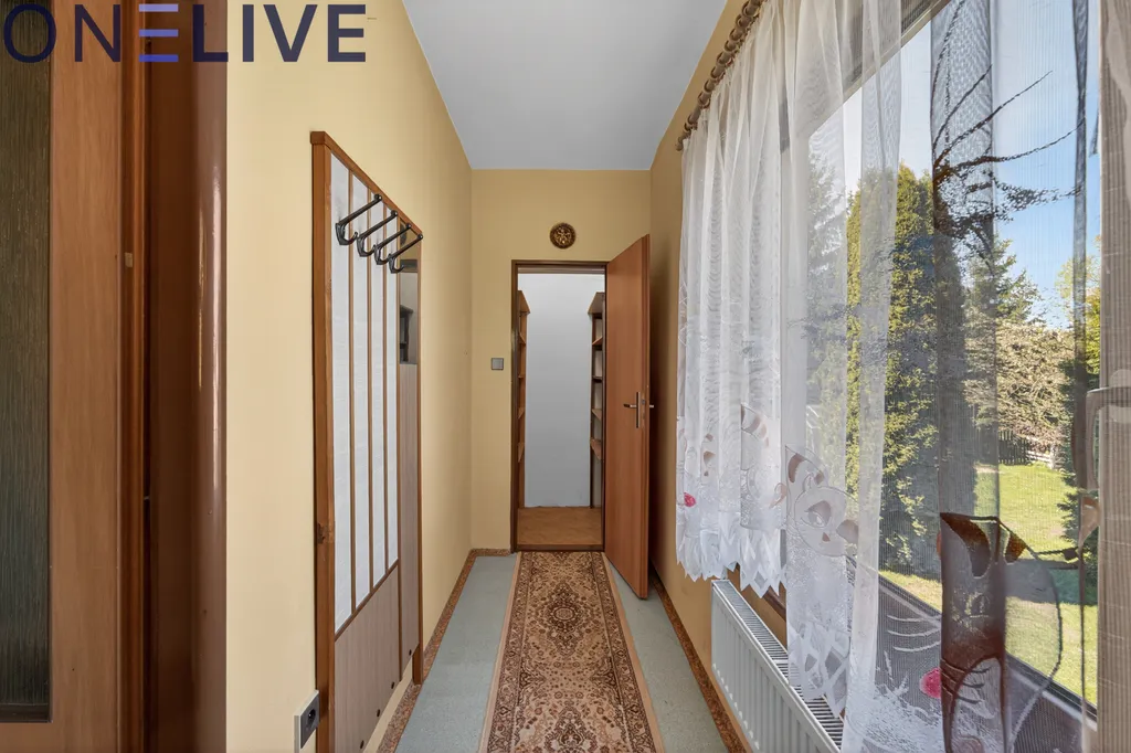 V přízemí se nachází kuchyně s plynovým sporákem, obývací pokoj, ložnice, dětský pokoj, koupelna se sprchovým koutem a toaletou, prostorná chodba, veranda a spíž.