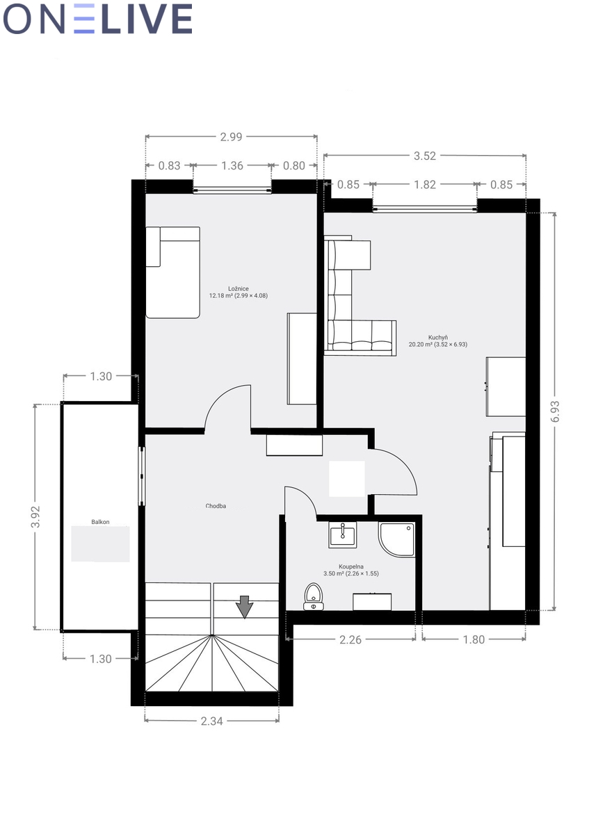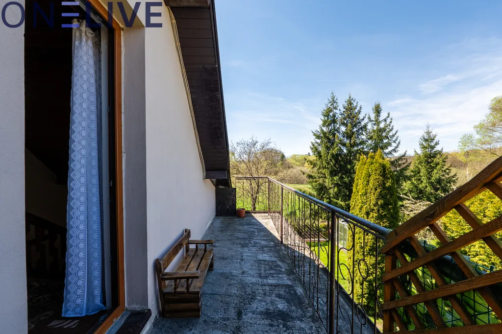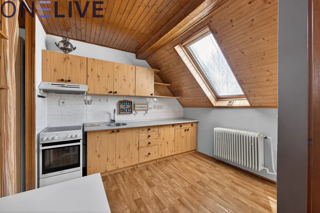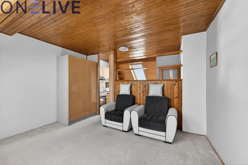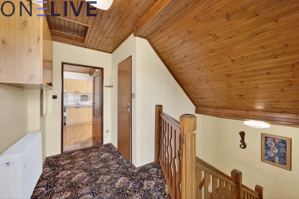 Po schodišti se dostaneme do prvního patra, kde je samostatná bytová jednotka s kuchyňským koutem propojeným s obývacím pokojem, ložnicí a koupelnou se sprchovým koutem a WC. Z chodby je vstup na balkon s výhledem do zahrady.
