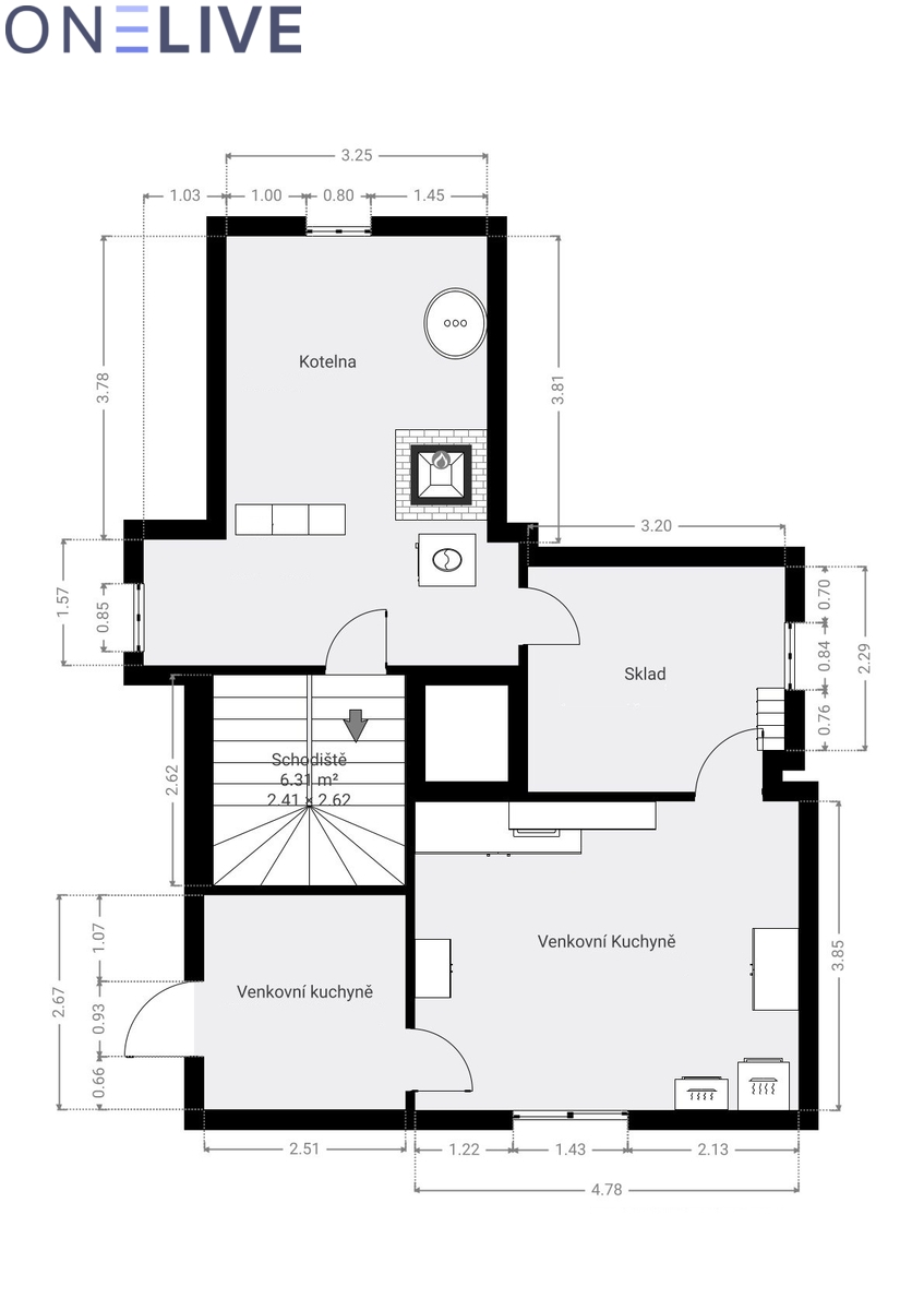 Dům je podsklepený. Ve sklepních prostorách se nachází technické zázemí včetně kotle na tuhá paliva (24 kW), který umožňuje vytápění peletami, dřevem i uhlím. Kotel má automatickou násypku. Ohřev vody i vytápění lze řešit tímto kotlem, případně plynovým kotlem s vlastním bojlerem. Napojení na plyn je aktivní. Dále zde najdeme technickou místnost a vedlejší (pracovní) kuchyni pro letní vaření.