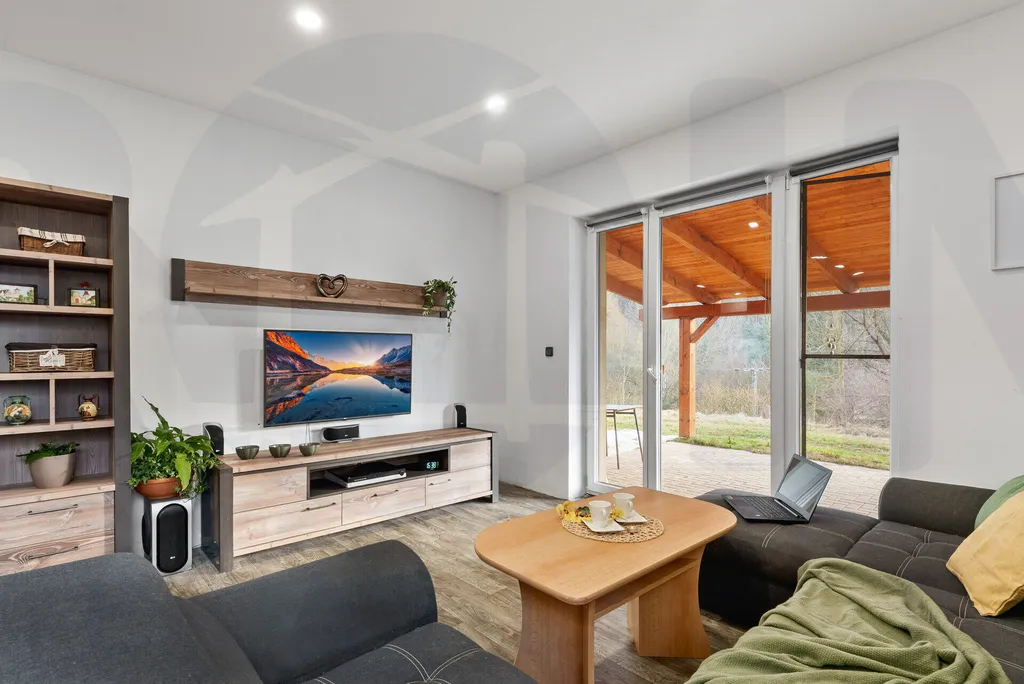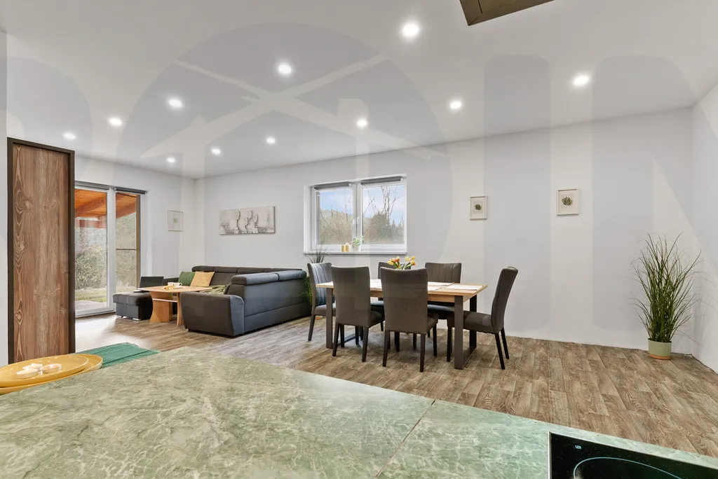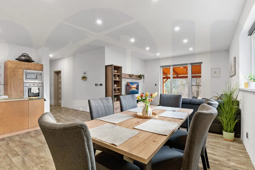 Dominantou nemovitosti je velkorysý obývací pokoj s kuchyňským koutem o velikosti přibližně 40 m², který tvoří přirozené centrum celého domu a poskytuje dostatek místa pro každodenní rodinný život i setkávání s přáteli.