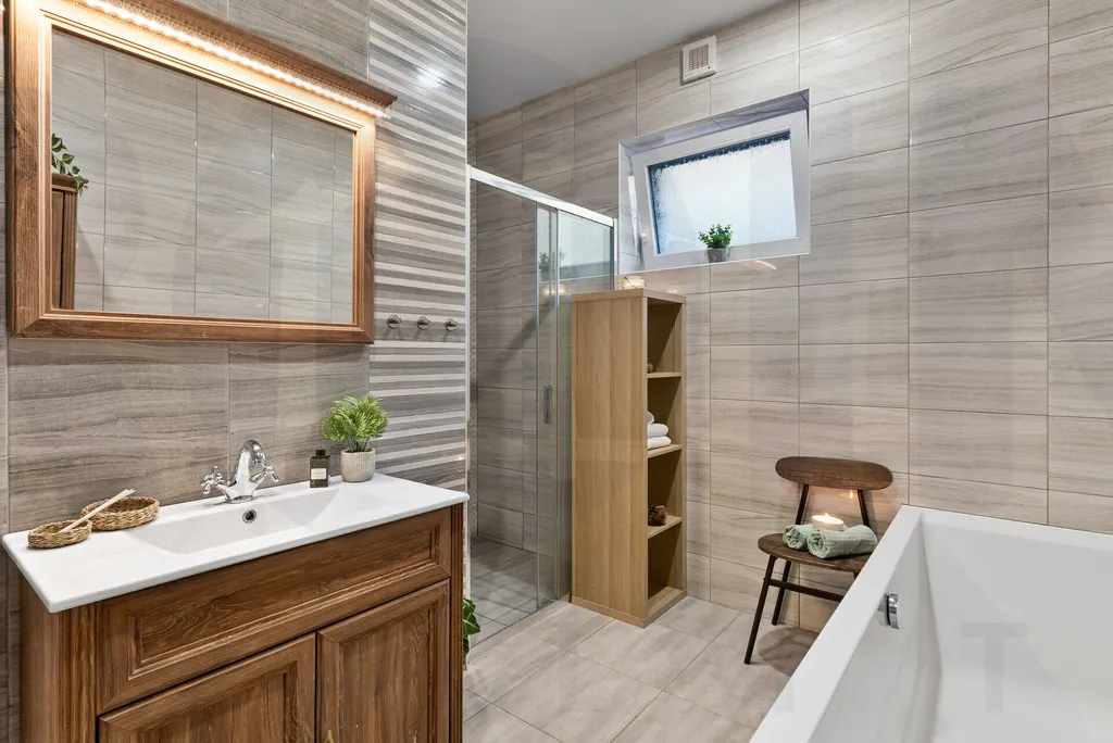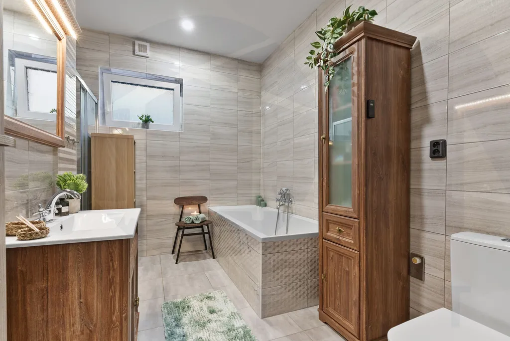 • prostornou koupelnu kombinující moderní design a funkčnost - elegantní vana + stylový sprchový kout,