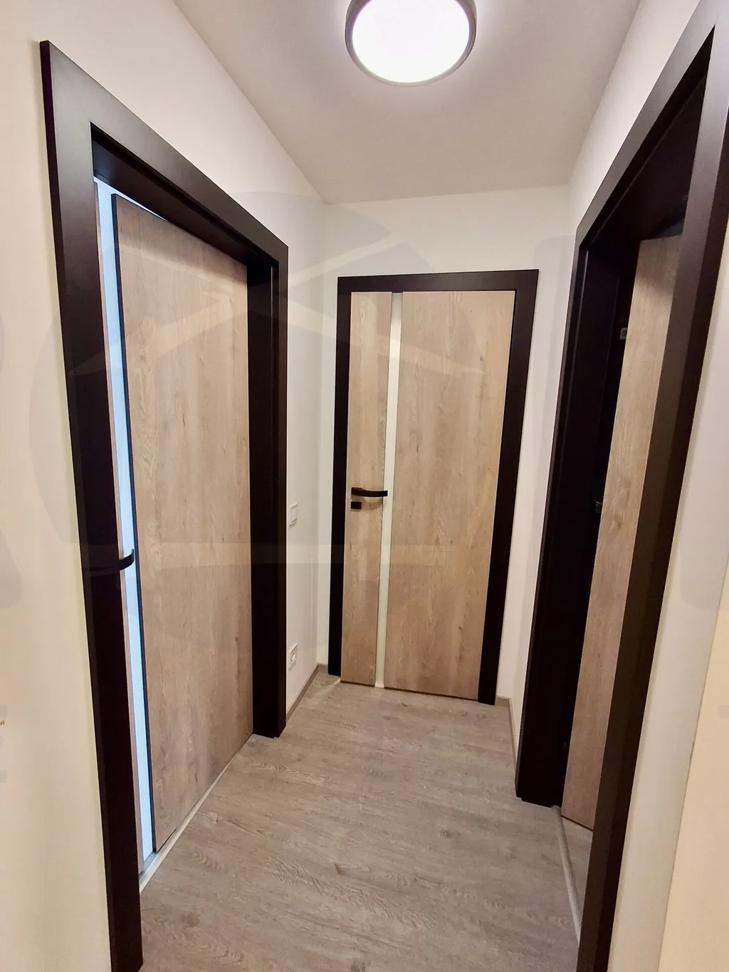 Celý byt působí vzdušně, čistě a nadčasově. Samozřejmostí jsou kvalitní vinylové podlahy v kombinaci s designovou dlažbou, moderní interiérové dveře a stylová koupelna s vanou.