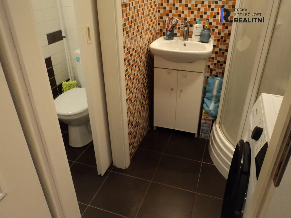 Byt má praktickou dispozici. Ze vstupní chodby je vstup do koupelny se sprchovým koutem, umyvadlem a pračkou. Toaleta je řešena samostatně.