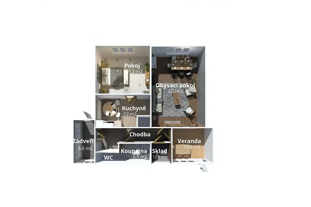 Dům je dispozičně řešen velmi prakticky. Ze vstupní předsíně se dostanete do hlavní chodby, odkud je vstup do jednotlivých místností kuchyně s jídelnou, která je průchozí do ložnice, dále do obývacího pokoje, koupelny se sprchovým koutem a toaletou, spíže a také na verandu. Dům je navíc podsklepený, což poskytuje dostatek úložného prostoru.