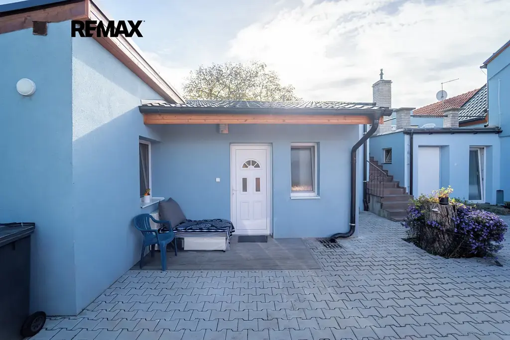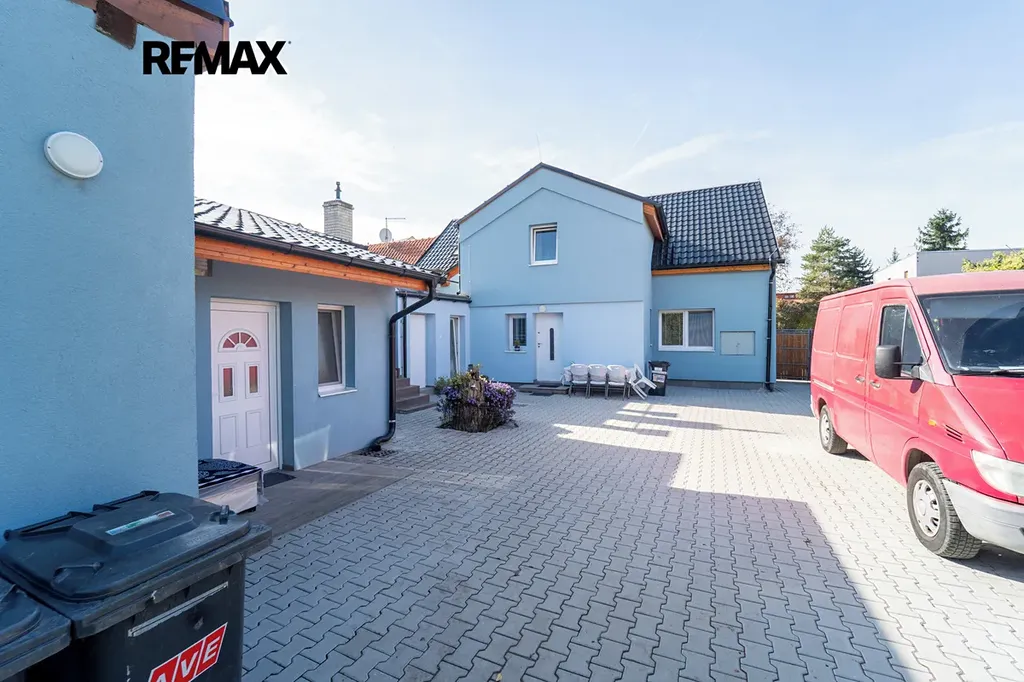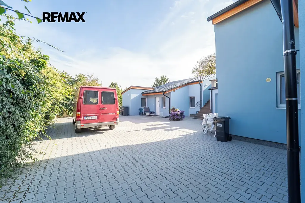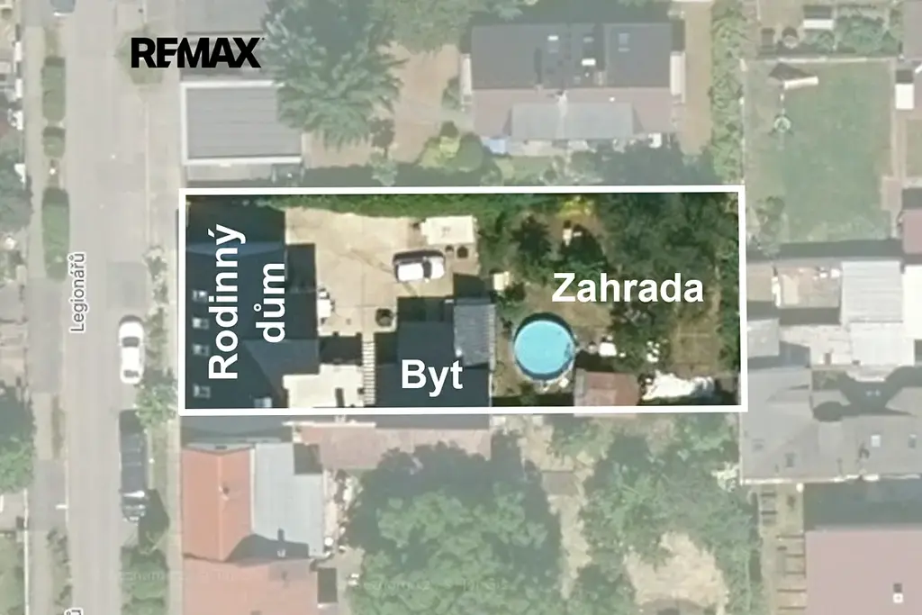 Zastavěná plocha a nádvoří domu o velikosti 358 m2 je osazeno zámkovou dlažbou a umožňuje vjezd na pozemek přímo z ulice Legionářů
