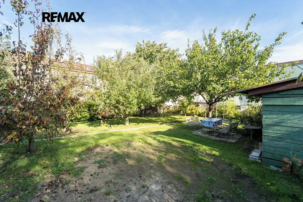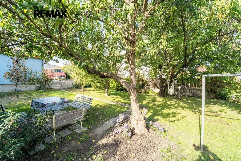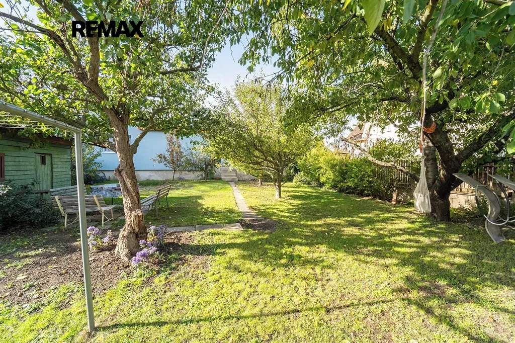 Zahrada u domu o velikosti 303 m2 poskytuje klid a útočiště s posezením pod ovocnými stromy vedle zahradního domku.