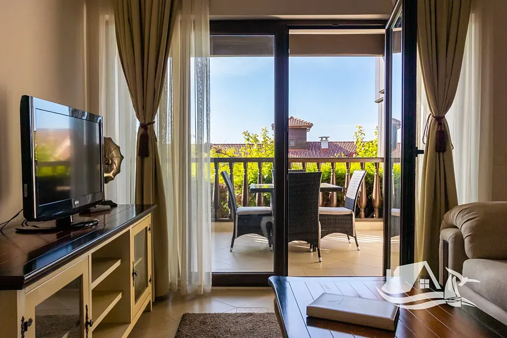 Nabízený dvoupokojový apartmán se nachází v 1. patře budovy Marina Village, blok 1, v části resortu, která je dlouhodobě velmi žádaná pro krátkodobý i hotelový pronájem. Dispozice je praktická a osvědčená pro vlastní užívání i investici. Obývací pokoj je doplněn samostatnou toaletou pro hosty, ložnice má vlastní koupelnu s toaletou a z terasy se otevírá příjemný výhled do areálu resortu. Přímý výhled na moře není, což se pozitivně odráží v ceně, zároveň však apartmán nabízí klidnější polohu a snadnou dostupnost všech služeb.
