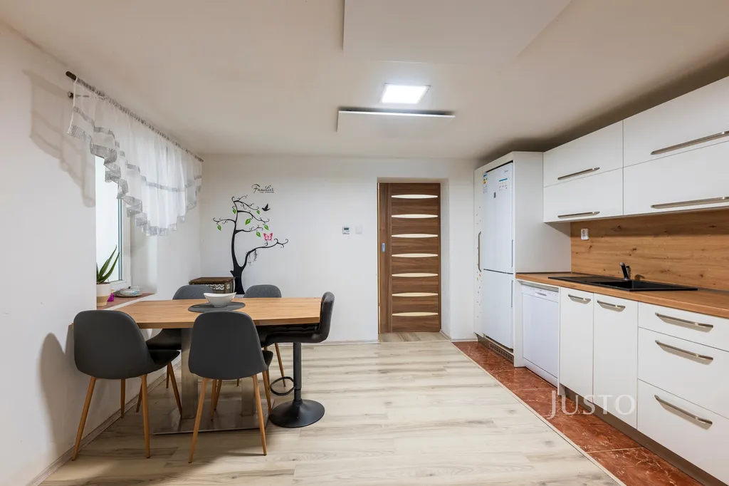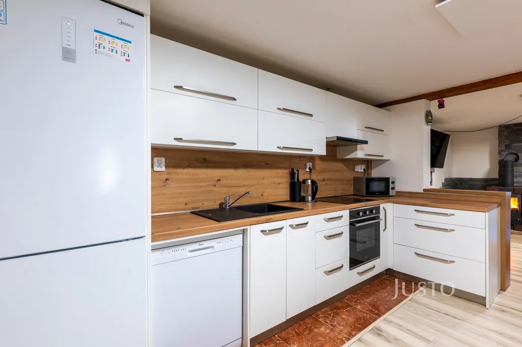 Dům se prodává vybavený nábytkem, který je vyrobený na míru, včetně kuchyňské linky s lednicí a s vestavěnými elektrospotřebiči sklokeramická deska, trouba, myčka, mikrovlnná trouba a digestoř zn. Midea.