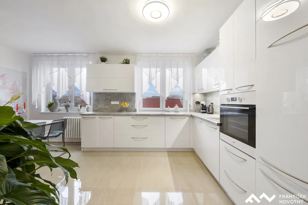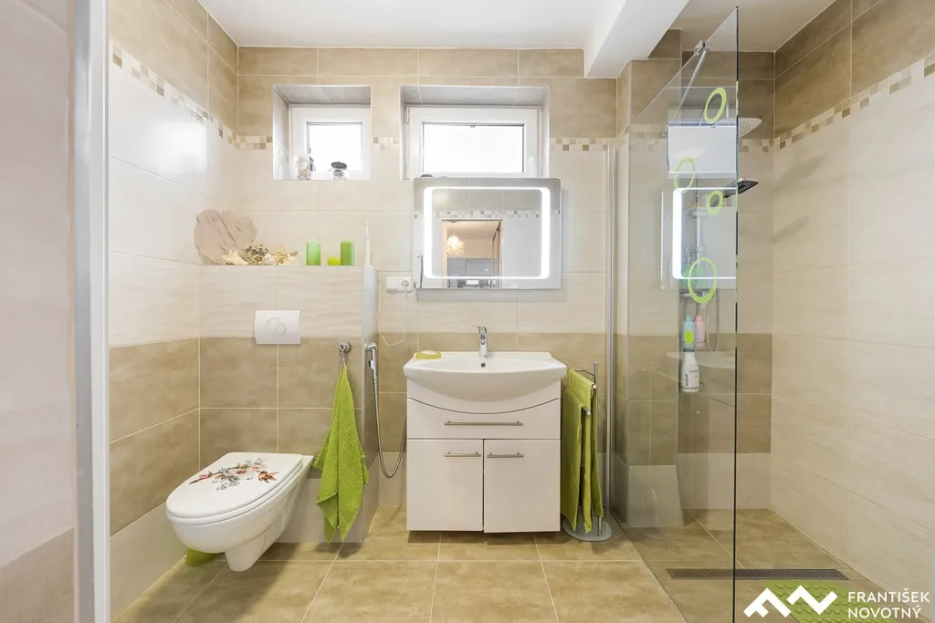 Hlavní obytné podlaží prošlo kompletní modernizací – kuchyně, koupelna, podlahy i dveře.