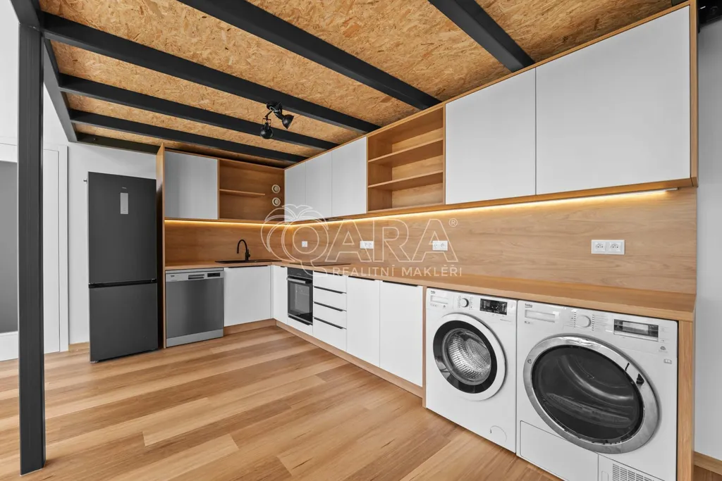 Velkou výhodou bytu je samostatný vstup zvenku, takže nemusíte chodit přes společné prostory domu. Součástí vybavení je kuchyňská linka se spotřebiči (varná deska, lednice, digestoř, myčka), dále pračka a sušička. Byt má předokenní rolety a budou ještě dodány záclony a závěsy.