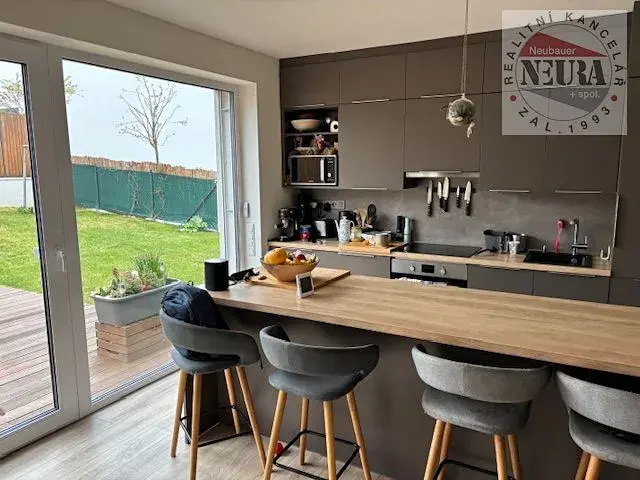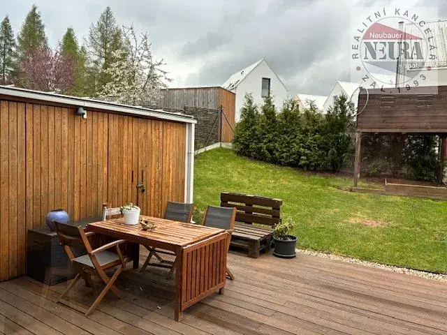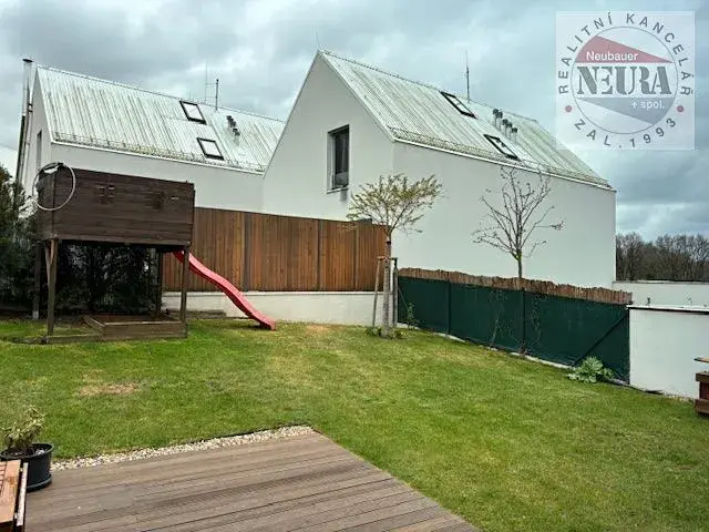 velmi krásné bydlení v areálu Green Village u golfového resortu Konopiště, samostatná polovina dvojdomu z roku 2020, plocha domu cca 144,5 m2 + terasa cca 24,5 m2, 2x zastřešené parkovací stání, zahradní domek, přes ulici koupací jezero s molem a pláží (kořenová vegetační čistička), volné cca od 1.8. 2026, dům se pronajímá bez zařízení,