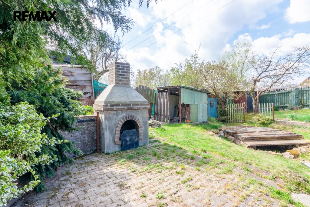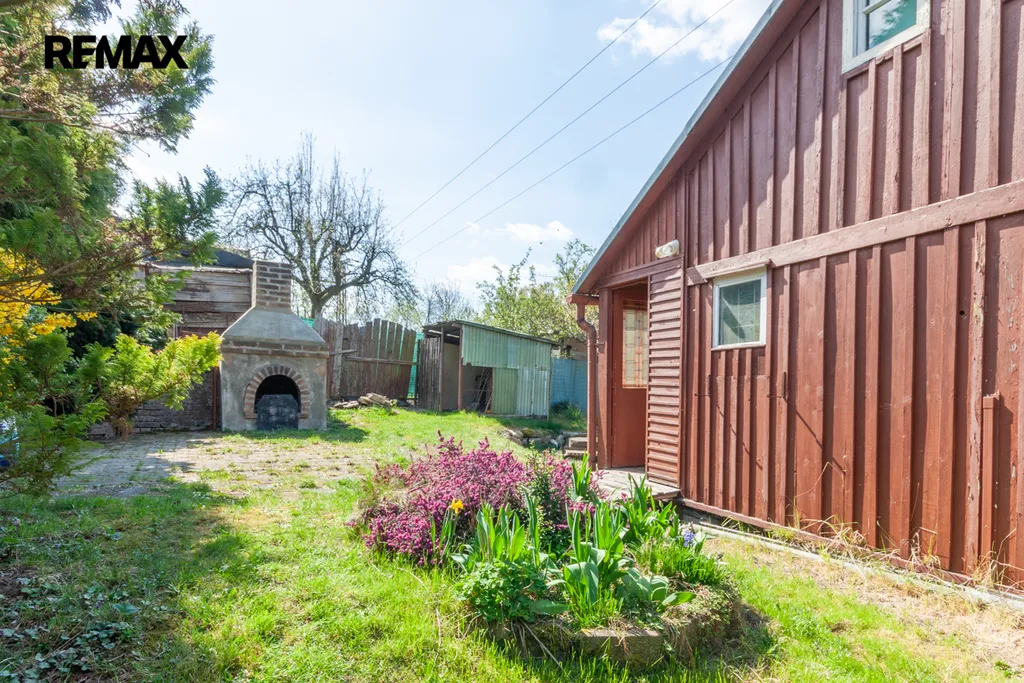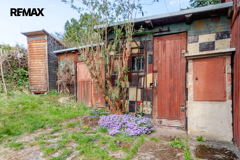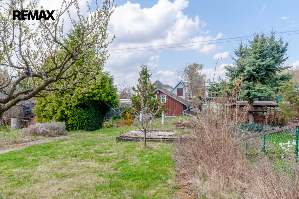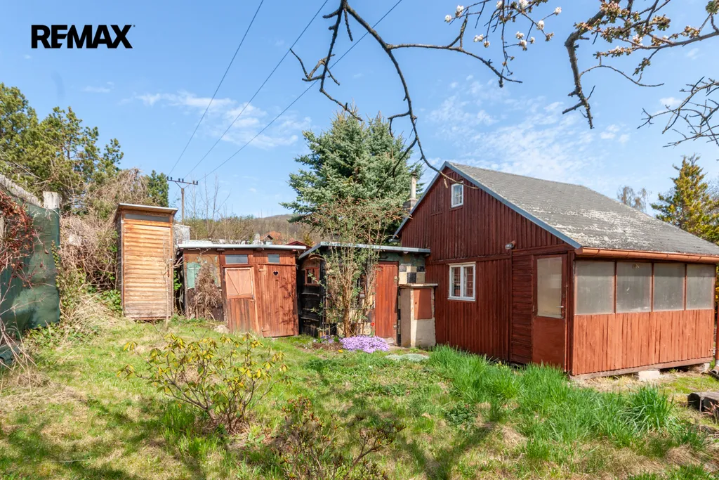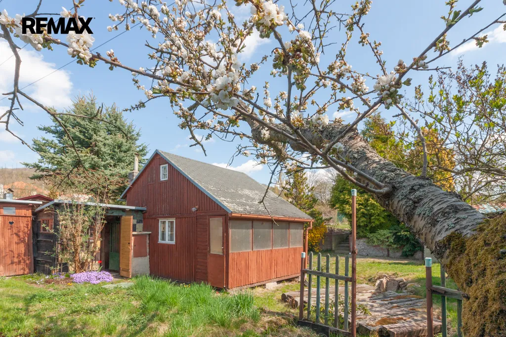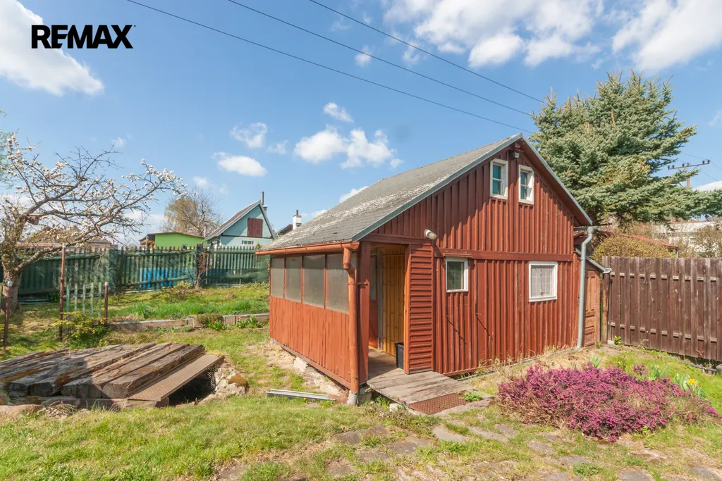 Součástí zahrady je zahradní nepodsklepená chata s podkrovím. V přízemí je veranda, víceúčelová místnost s kuchyňským koutem, šatna a schodiště do podkroví. V podkroví je místnost využívaná jako ložnice. Na chatu navazuje místnost na zahradnické nářadí. Naproti chatě je do terénu usazený velmi kvalitní sklep, kde vám ovoce i zelenina vydrží od podzimu až do pozdního jara. Vedle sklepu je místnost s lázeňským kotlem k osprchování.