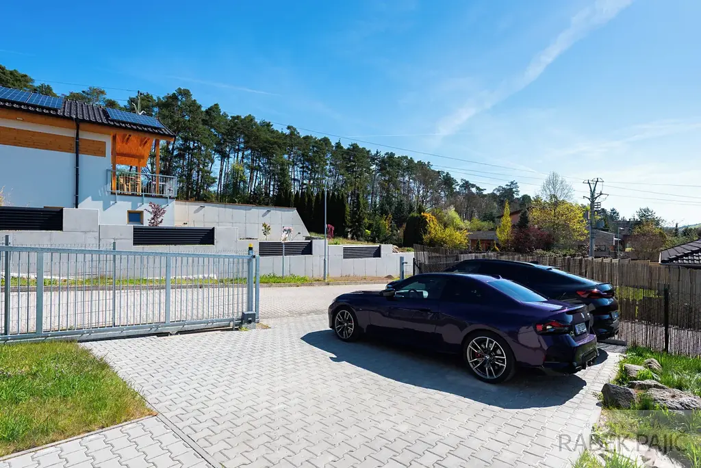K dispozici jsou tři parkovací místa, elektrická vjezdová brána na dálkové ovládání, terasa ideální pro rodinné posezení i retenční nádrž na dešťovou vodu o objemu 4 m³. Samozřejmostí je zabezpečovací systém Jablotron a videotelefon s ovládáním vstupní branky, které zvyšují bezpečí celé rodiny.