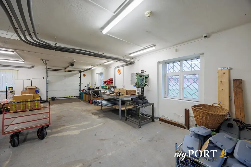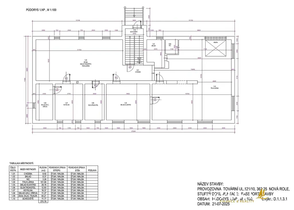 • 1. NP (271 m²): Výrobní a expediční prostory, skladovací zázemí, moderní kotelna a sociální zařízení.