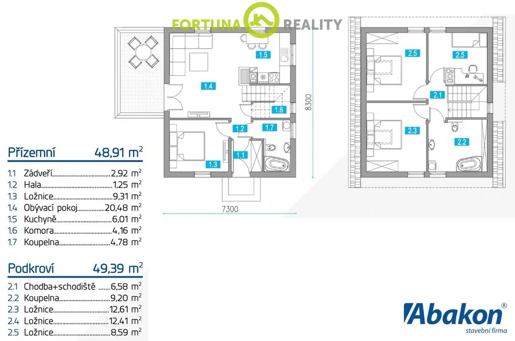 Dům je patrový a nepodsklepený s variantami 4 + kk až 5 + kk ideální pro malé stavební parcely. Základní varianta za nabídkovou je velkosti 4 + kk a třemi ložnicemi - podrobněji v půdorysech. Ve variantě s půdní nádstavbou se v přízemí domu nachází 1x ložnice, 1x koupelna s vanou, WC a technickou částí, obývací pokoj spojen s terasou, kuchyní a jídelnou. V 2. NP je 3x ložnice a 1x koupelna s WC a vanou. Dům je možné postavit s variantou základní + garáž.