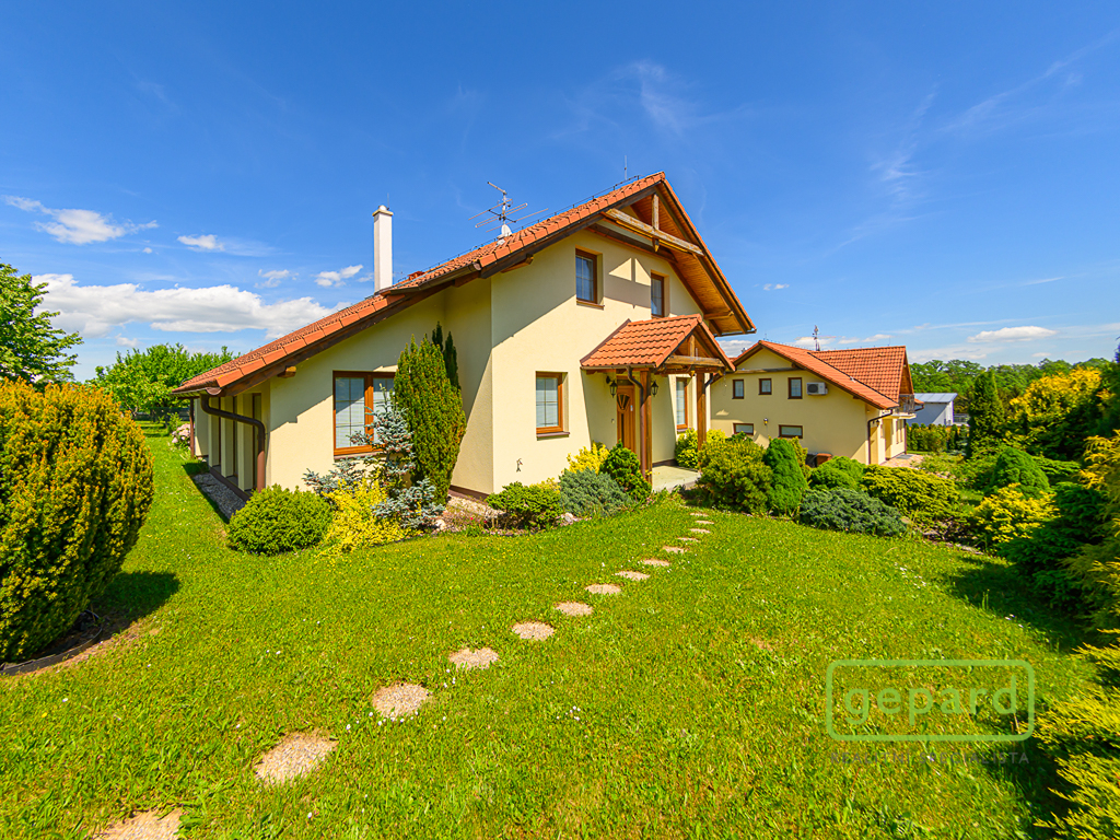 Okolo domu je kompletně oplocená, udržovaná zahrada s terasou a množstvím plodících a okrasných stromů a keřů, možnost vjezdu na pozemek a dálkově ovládaná vrata.